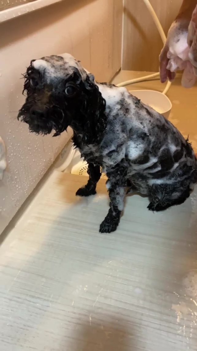 リーダとサトシは、シャンプーで2度洗いをします。濯ぎはしっかりと行い、お尻も忘れずに洗います。彼らは、飼い主の「大丈夫」という声に安心しながら、この洗浄の儀式を乗り越えます。
