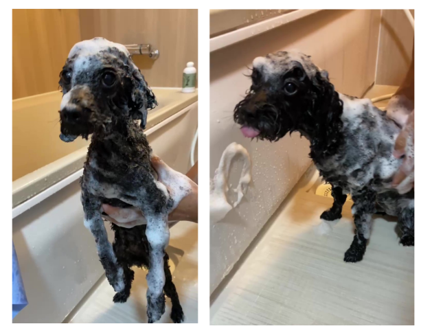 リーダとサトシは、シャンプーで2度洗いをします。濯ぎはしっかりと行い、お尻も忘れずに洗います。彼らは、飼い主の「大丈夫」という声に安心しながら、この洗浄の儀式を乗り越えます。